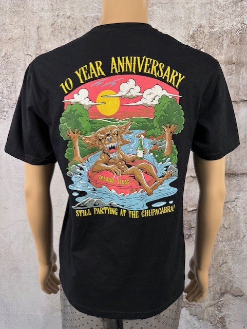 Celebrate a decade of great beer with our limited edition 10-Year Anniversary V-Neck T-Shirt. This dark gray, heathered tee features a small, clean Chupacabra logo on the front left chest. The back of the shirt is where the party’s at, showcasing a vibrant, full-color graphic of the Chupacabra himself, chilling in a river with a cold beer and a “Still Partying at the Chupacabra” message. It’s the perfect way to show your support for your favorite craft brewery and commemorate this special milestone. This comfortable and stylish shirt is made from a soft, high-quality fabric, making it ideal for brewery visits, parties, or just lounging around. Don’t miss your chance to own a piece of Chupacabra history!