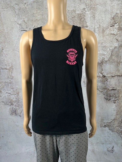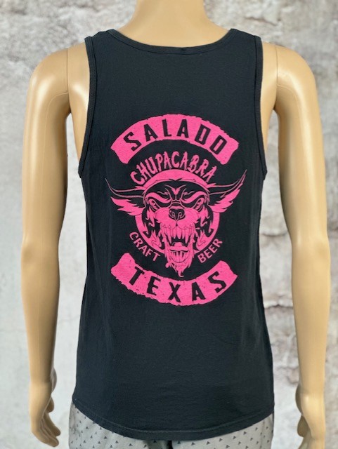 Stay cool and show your support for Chupacabra Craft Beer with this black tank top. The front features a smaller version of the “Salado Chupacabra Craft Beer Texas” logo in a bold, vibrant pink on the left chest. The same eye-catching design is featured in a larger size on the back, making a statement whether you’re at the brewery or out on the lake. Made from a soft, comfortable material, this tank top is perfect for hot Texas days.