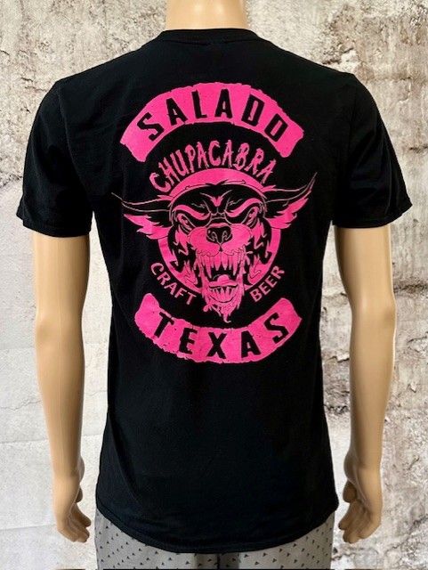 Chupacabra Craft Beer Logo T-Shirt Show off your love for local craft beer with this unique V-neck t-shirt. The shirt features a distressed, textured look that gives it a vintage feel. On the front, a small, eye-catching logo with “Salado Chupacabra Craft Beer Texas” is printed on the left chest. The back of the shirt features the same bold design in a larger size, making a statement from every angle. This shirt is designed for comfort and style, perfect for a day at the brewery, a night out, or just relaxing at home. It’s a must-have for any fan of Chupacabra Craft Beer.