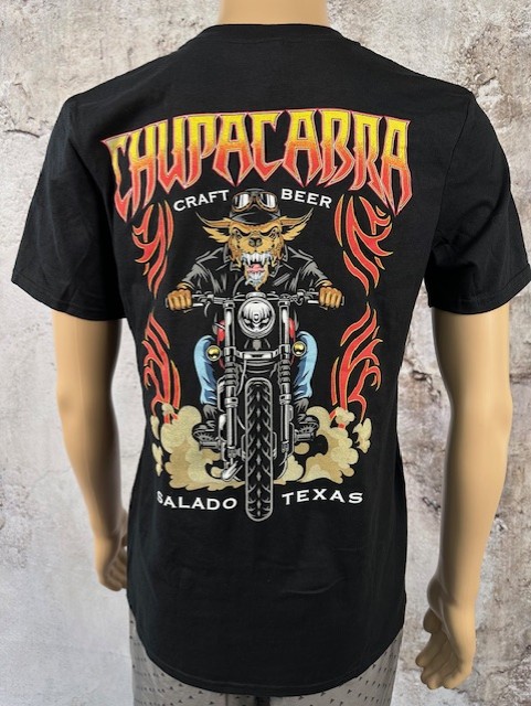 Hit the road with this killer black crewneck t-shirt. The front features a smaller version of the Chupacabra logo in gold on the left chest. The back of the shirt is where the real action is, with a large, vibrant graphic of the Chupacabra riding a motorcycle. It’s the perfect way to show your love for Chupacabra Craft Beer and the open road.